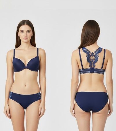 Elegant Blue Ornate Lace Back Bra Set with Soft Support & Stylish Detailing